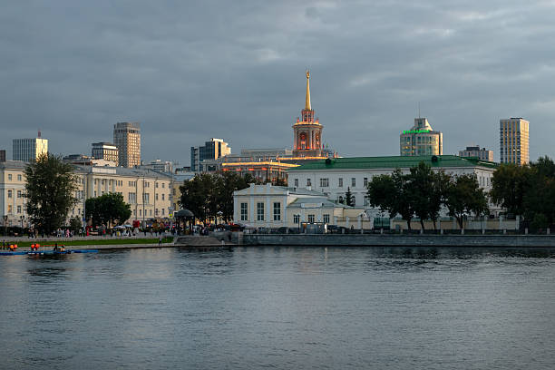 YEKATERINBURG, RUSSIA. Beautiful night city landscape. View from the side of the City pond on Lenin Avenue